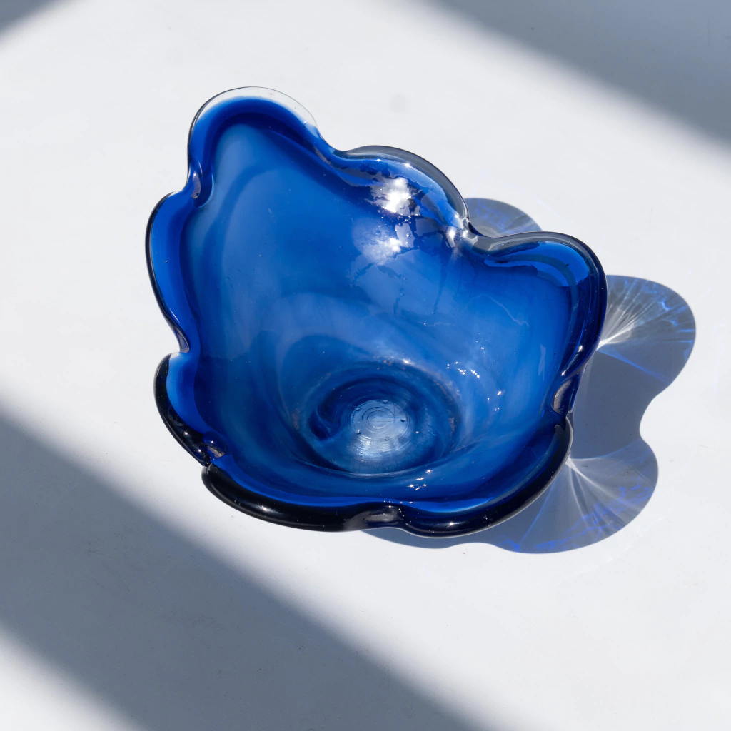 Esta pieza parece capturar el movimiento del agua en pleno gesto. Las curvas onduladas, la profundidad del azul cobalto y el grosor del cristal revelan el trabajo artesanal característico del Murano más expresivo.