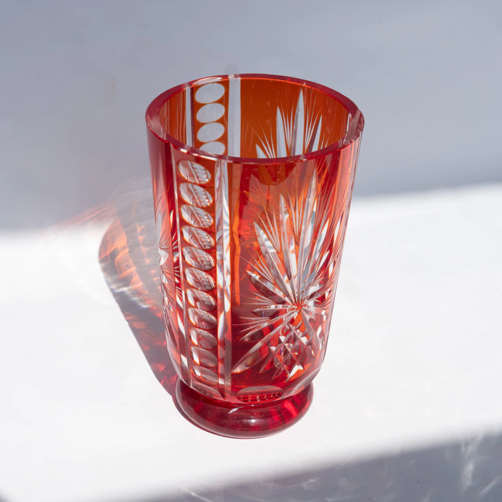 Una joya de cristal que combina la fuerza del rojo con la delicadeza de los tallados. El contraste entre las formas geométricas y las líneas florales crea un efecto visual impactante, capaz de transformar cualquier rincón en un punto focal.