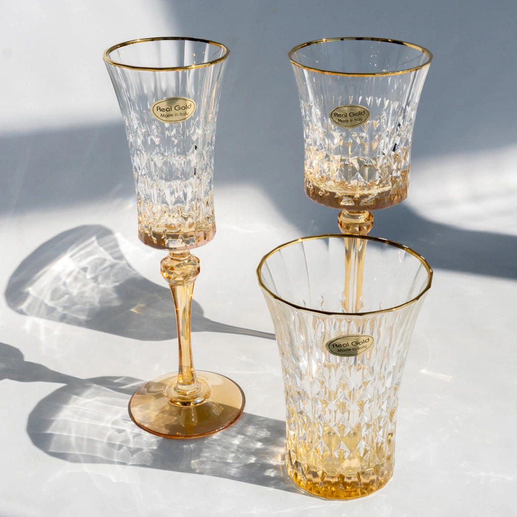 El modelo Ámbar Lux fue diseñado para quienes saben que la belleza también se sirve. Con un diseño facetado que refleja la luz como una joya, esta colección de cristal italiano eleva cualquier brindis, cena o encuentro cotidiano.