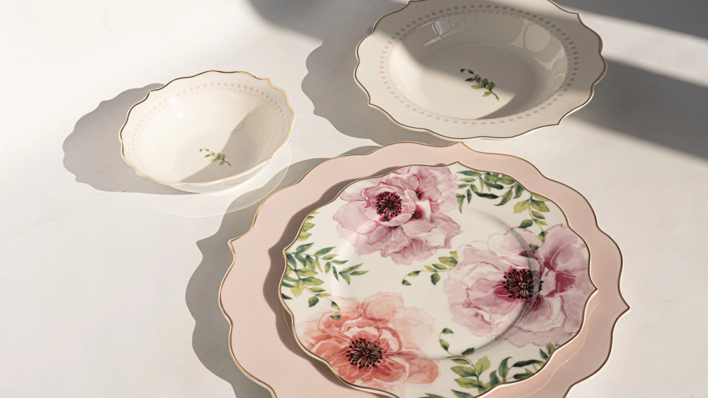 Sus bordes ondulados, delineados en dorado, evocan la delicadeza de un pétalo al sol. Los tonos pastel, las flores pintadas como a pincel suave, y la pureza del blanco crema, transforman cualquier comida en una escena de calma y belleza.