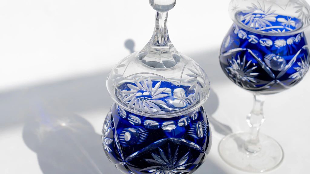 Un dúo imponente para quienes aprecian los objetos con presencia. Estas carameleras de cristal tallado combinan la elegancia del diseño tradicional con la fuerza del color azul cobalto profundo. El contraste entre el cuerpo tallado y la tapa decorada con estrellas de cristal claro les da una vibra majestuosa que transforma cualquier espacio.