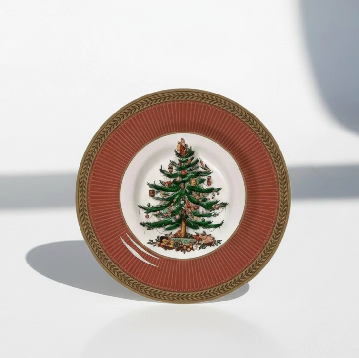 El espíritu de las fiestas se celebra en los detalles. Esta colección de platos navideños en porcelana premium combina diseño clásico con un aire sofisticado y cálido. Los icónicos pinos navideños decoran el centro de los platos de postre, disponibles en verde y rojo, mientras que los platos principales alternan bordes verde olivo y beige con elegantes motivos dorados.