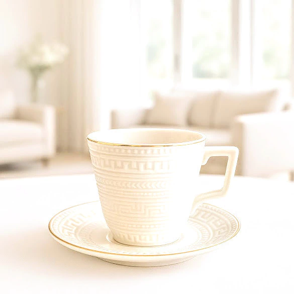 El set “Versace” retoma el blanco clásico, lo combina con relieves inspirados en patrones griegos, y lo traduce en porcelana con diseño contemporáneo.